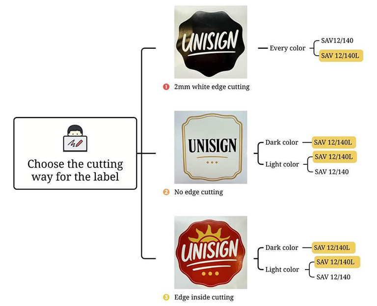 Labels with 2mm white edge cutting can be made by SAV12/140 and SAV12L. The other two cutting methods can only be made with SAV12/140 when producing light color labels.
